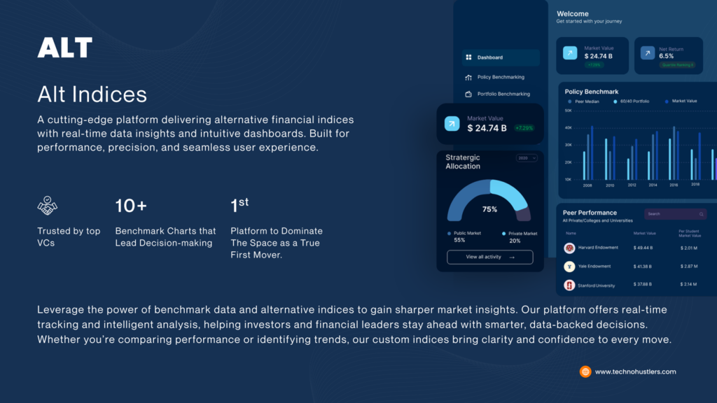 Alt Indices is a cutting-edge financial intelligence platform in the Fintech space designed to help investors, analysts, and finance professionals derive insights from benchmark performance charts and advanced market data — going beyond traditional metrics to offer intelligent, intuitive financial visualization tools. Users can explore multiple standardized financial charts and make data-driven decisions with precision, confidence, and speed