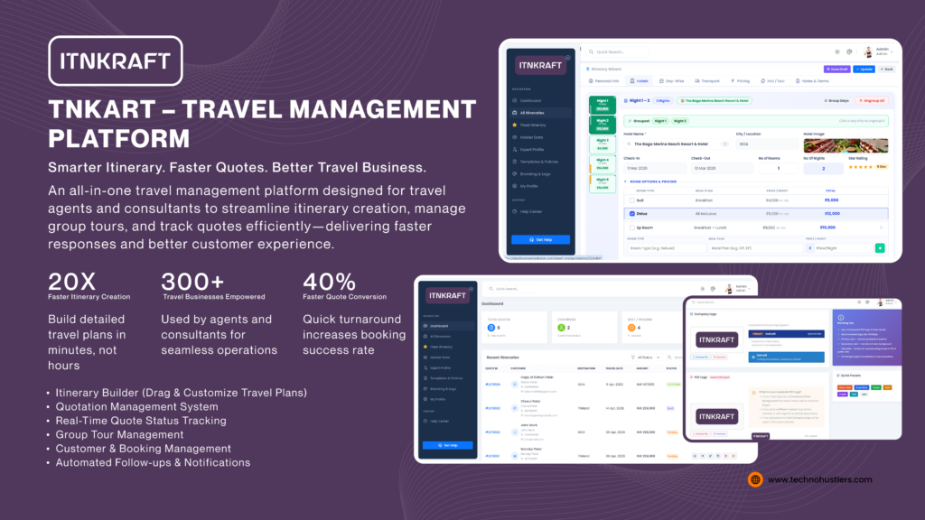 ItinKart is a smart travel operations platform designed for travel agents and consultants to manage their entire workflow — from itinerary creation to quotation tracking.The platform enables: